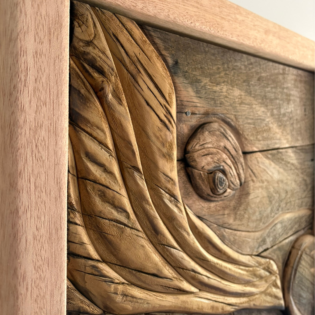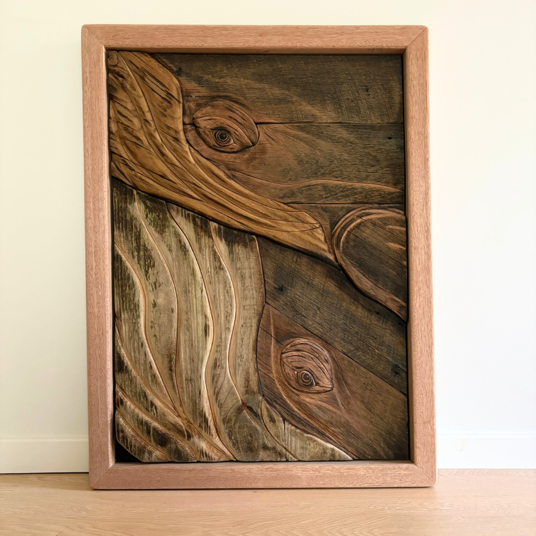 Enduring Love is a unique framed wall sculpture capturing a quiet moment between a mother humpback whale and her calf, swimming closely side by side. Made from 100% reclaimed Australian timber, this piece is a powerful tribute to the lasting bond shared between mother and child.