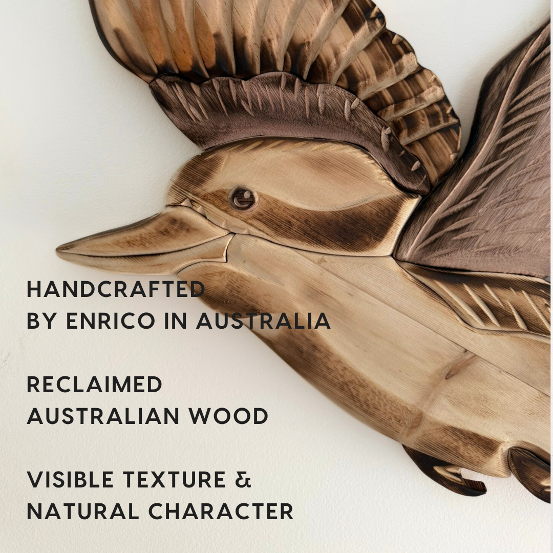 This Kookaburra Sculpture is a striking tribute to one of Australia’s most recognisable native birds. Handcrafted from 100% reclaimed Australian timber, this sculptural wall piece captures the bold posture and distinctive character of the kookaburra, celebrated for its presence and symbolism in the Australian landscape. Carefully layered timber and hand-cut detailing bring depth, warmth, and texture to this refined artwork.