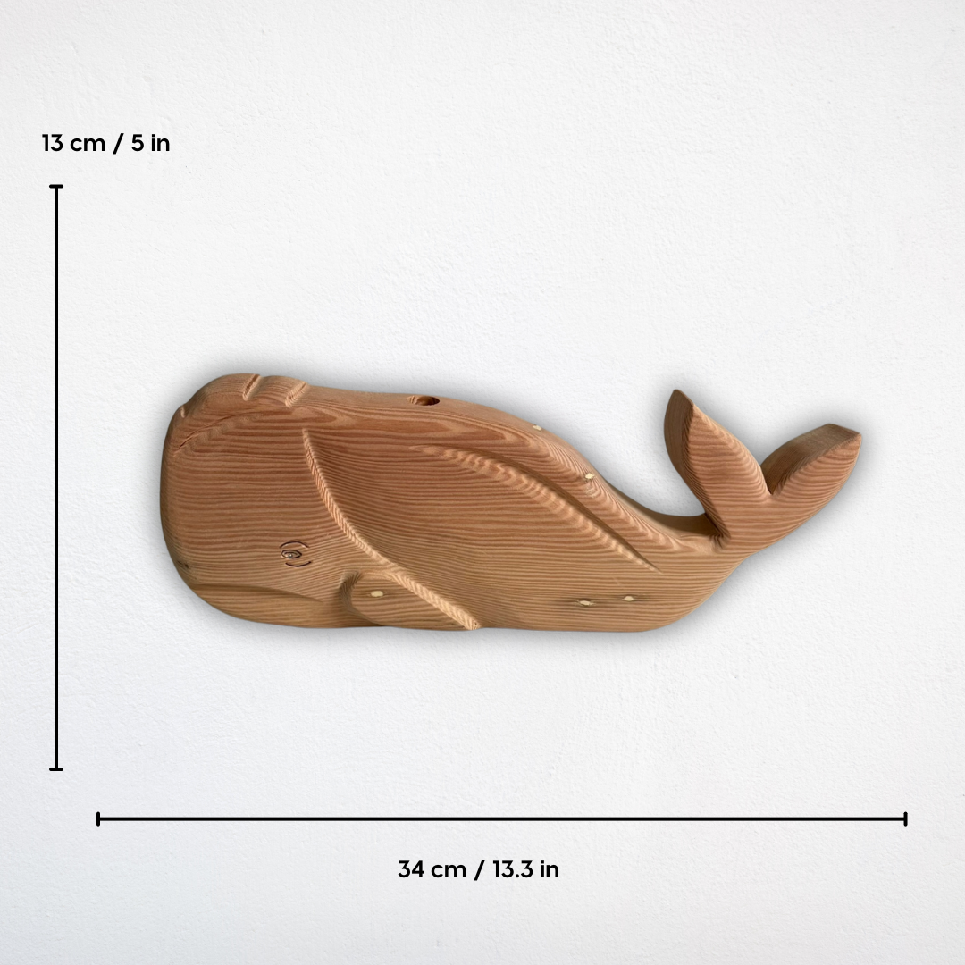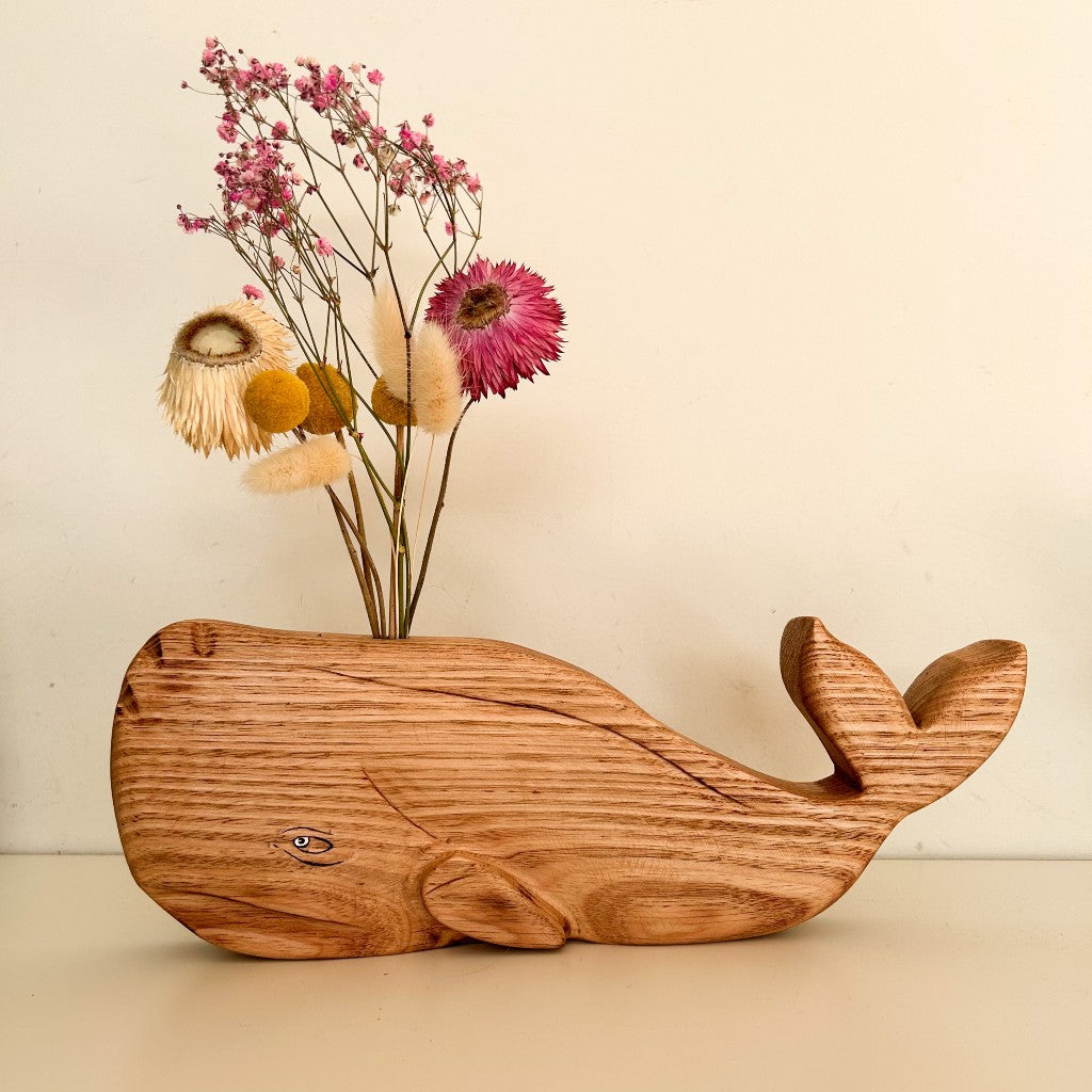 This Whale Vase Sculpture combines natural beauty with everyday function. Hand-carved from 100% reclaimed Australian timber, it features the elegant form of a whale with a slim, built-in opening to hold dried flowers or small decorative stems.