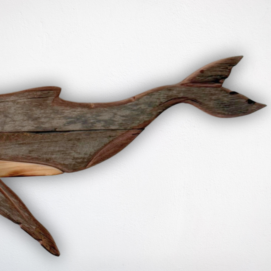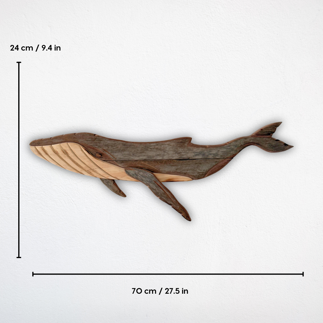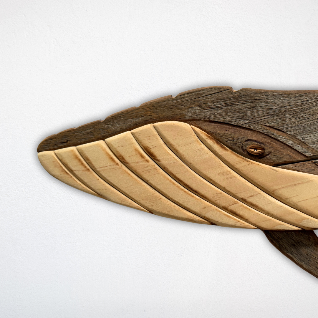 Whale Song is a handcrafted sculpture of a humpback whale, made from reclaimed Australian timber and brought to life through careful detail and thoughtful design. Measuring 70 cm wide, this piece features an eye crafted from multiple small pieces of wood, forming a layered, textured focal point that adds depth and emotion to the sculpture.