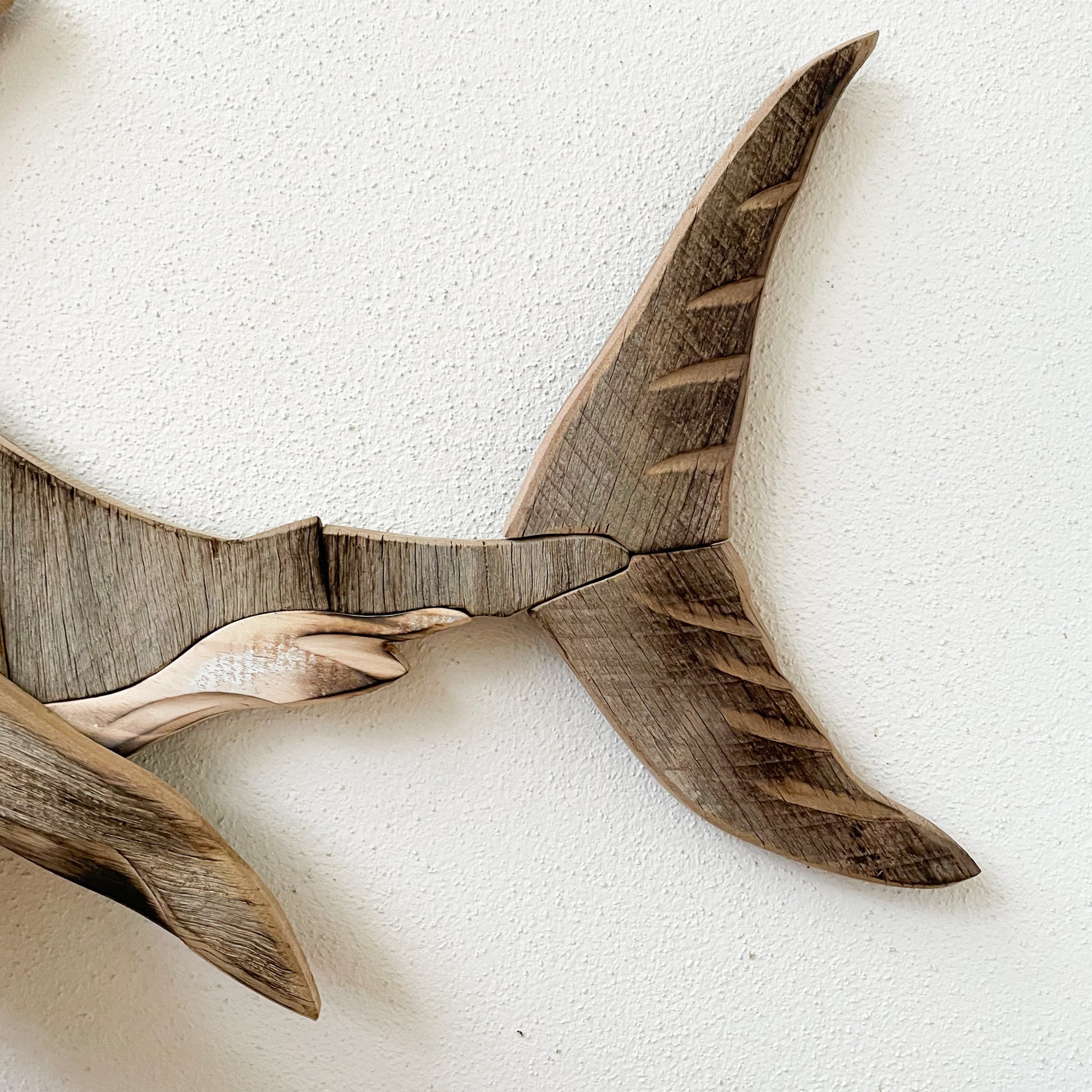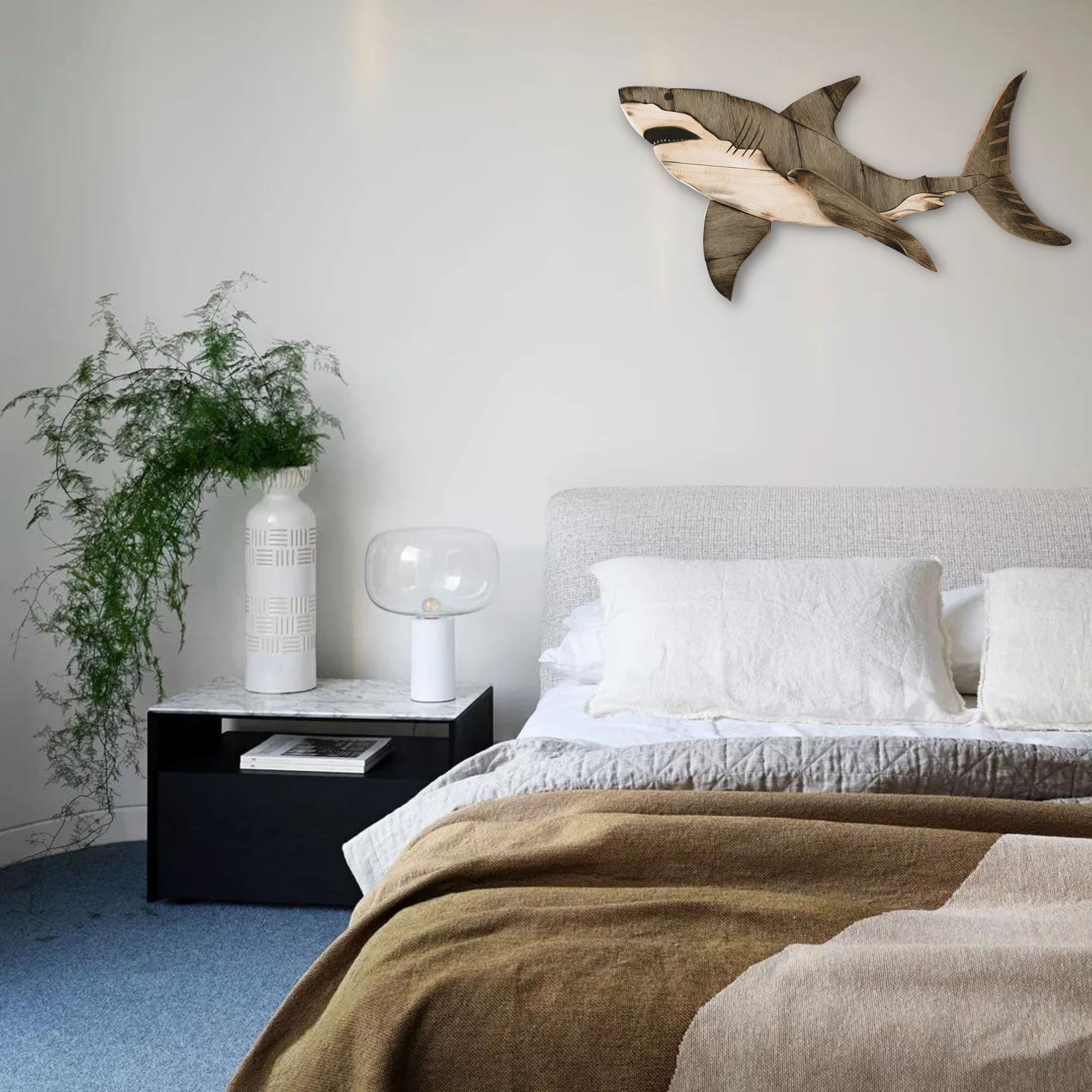 This Great White Shark is the mini version of our biggest craft which is the Real Size Great White Shark. It is made of pieces of fence and rustic pallets. These pallets are carefully shaped to get this incredible white shark. The wood is hand selected for its coloration and cut by hand.